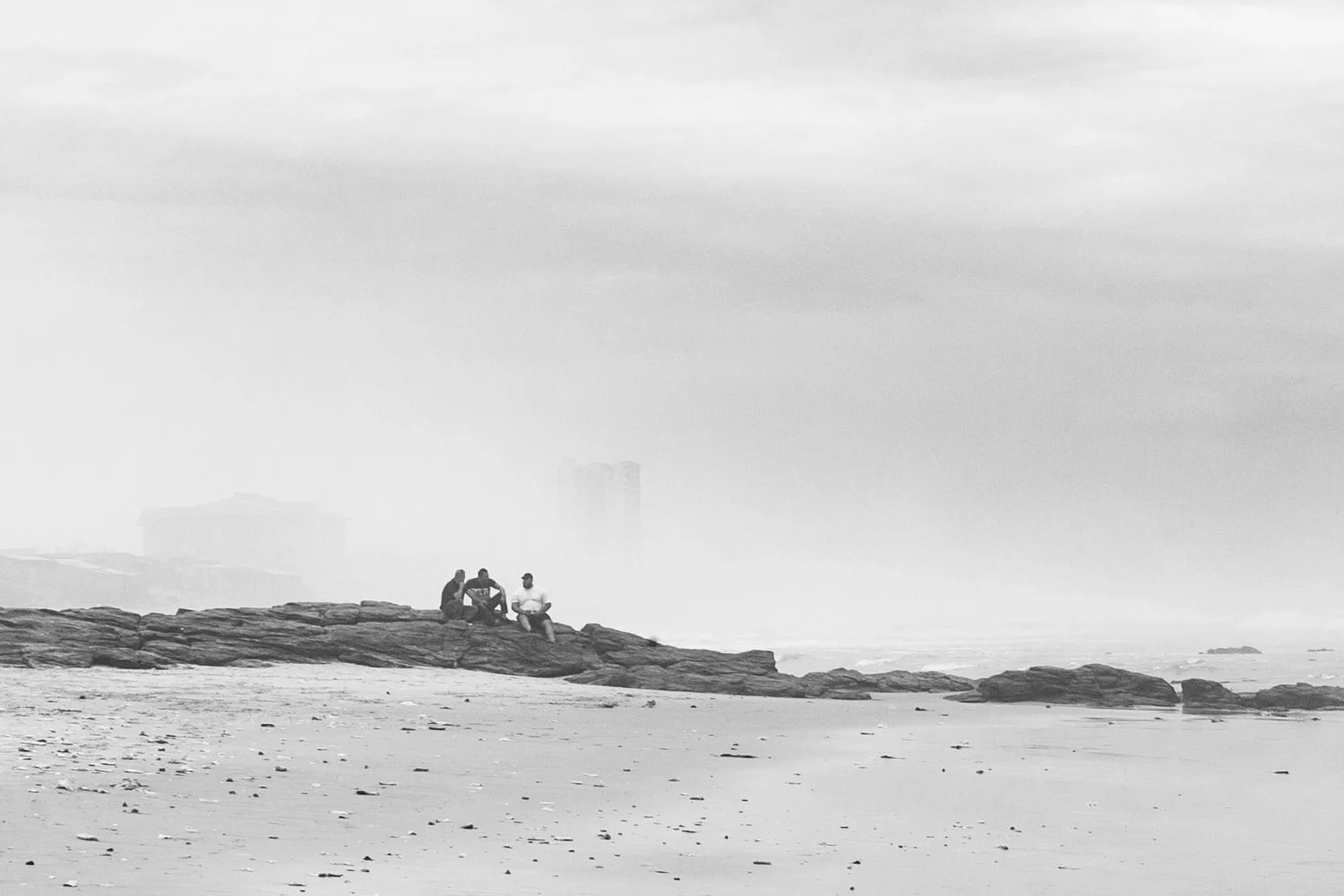 Three friends hanging out on a rock on the beach in Osu on a hazy Sunday afternoon. During Harmattan the combination of haze and seaspray is quite dramatic.
